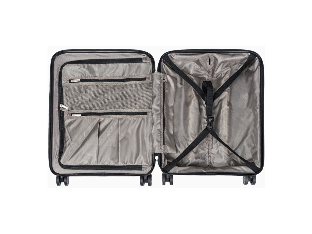 Pečlivě promyšlený vnitřek kufru zajišťuje pohodlné balení a pořádek během cesty. Hlavní přihrádka je rozdělena na dvě části. První část má nastavitelná ramínka, která zabraňují klouzání šatní skříně. Druhá polovina je uzavřena přihrádkou na zip se dvěma kapsami na zip. Přihrádky jsou vyloženy elegantní podšívkou.