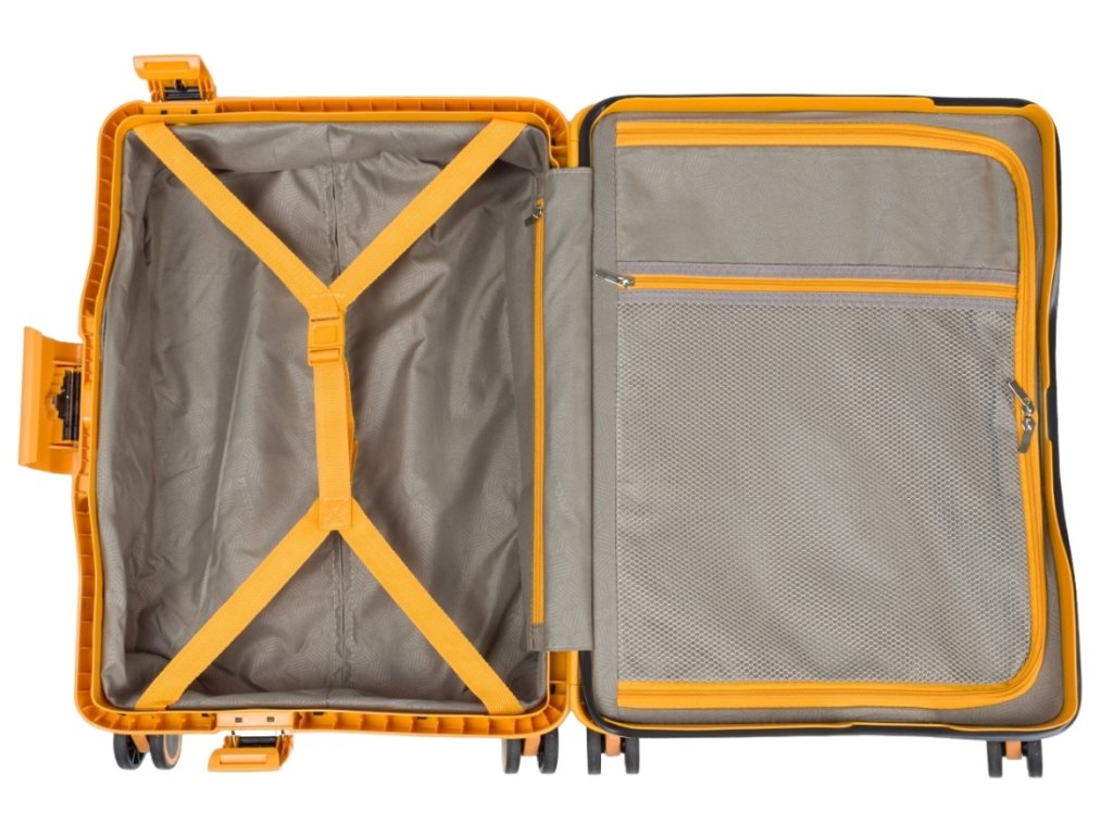 Pečlivě promyšlený vnitřek kufru zajišťuje pohodlné balení a pořádek během cesty. Hlavní přihrádka je rozdělena na dvě části. První část má nastavitelná ramínka, která zabraňují klouzání šatní skříně. Druhá polovina je uzavřena přihrádkou na zip se dvěma kapsami na zip. Kufr má navíc dlouhou funkční kapsu na zip. Komory jsou lemovány elegantní podšívkou se značkou Puccini.