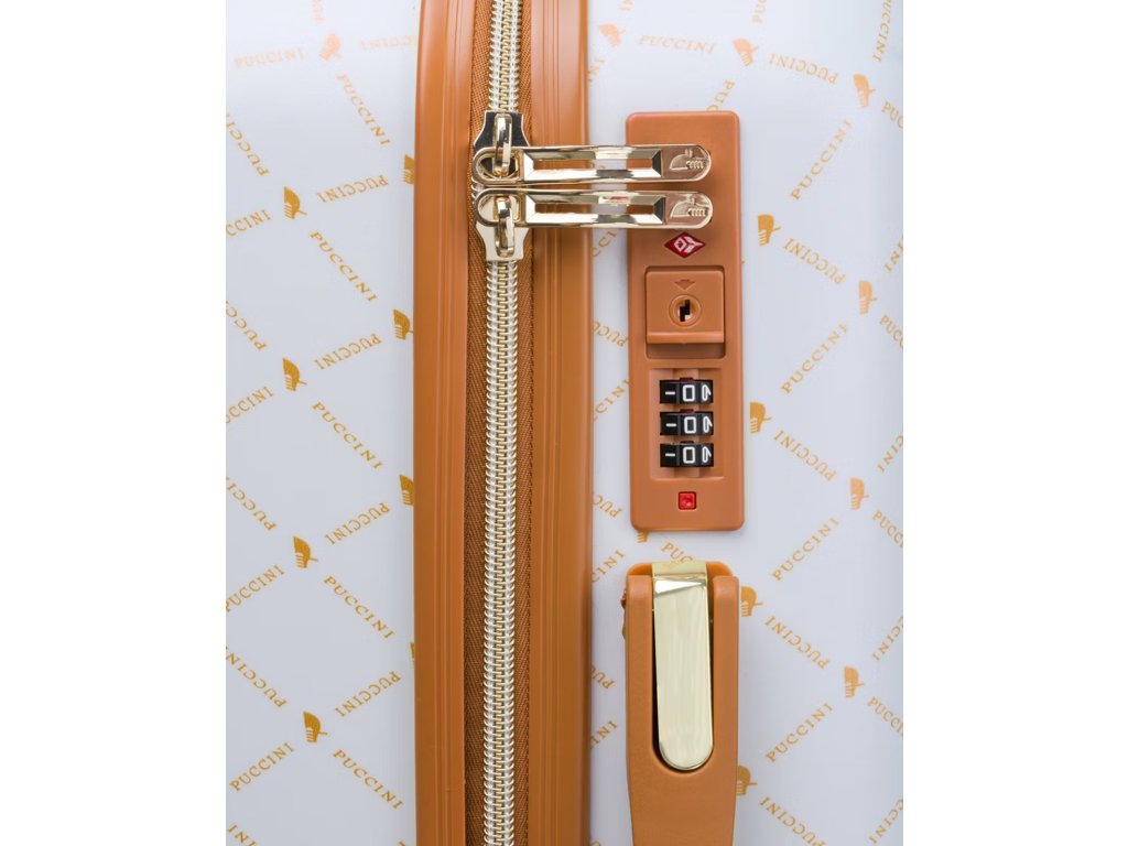 Pečlivě promyšlený vnitřek kufru zajišťuje pohodlné balení a pořádek během cesty. Hlavní přihrádka je rozdělena na dvě části. První část má nastavitelná ramínka, která zabraňují pohybu oděvu uvnitř. Druhá polovina se uzavírá přihrádkou na zip, se síťovanou kapsou na zip a dvěma otevřenými kapsami. Vnějšek je lemován elegantní černou podšívkou s geometrickým vzorem. Všechny kovové prvky jsou zlaté barvy.