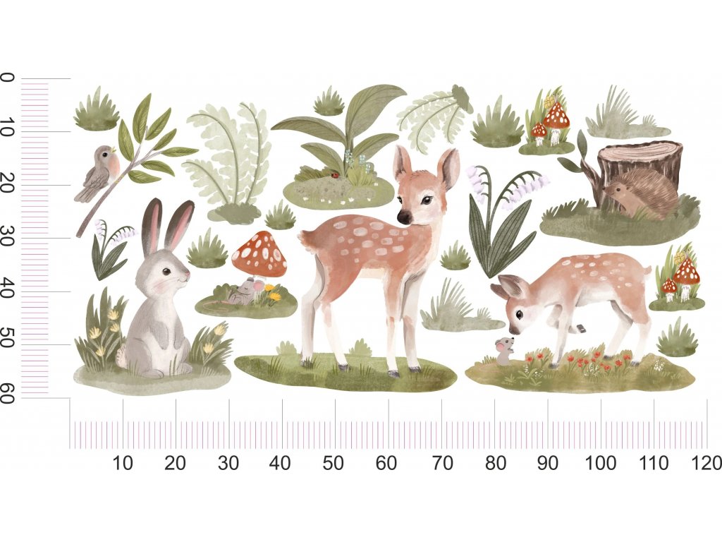 Samolepka na zeď do dětského pokoje s módním motivem lesní rodinky na mýtině v pastelových barvách. Taková dekorace je skvělý nápad na výzdobu dětského pokoje, určitě vykouzlí zářivý úsměv na tváři dítěte a skvělé živé barvy se budou skvěle vyjímat na stěně.