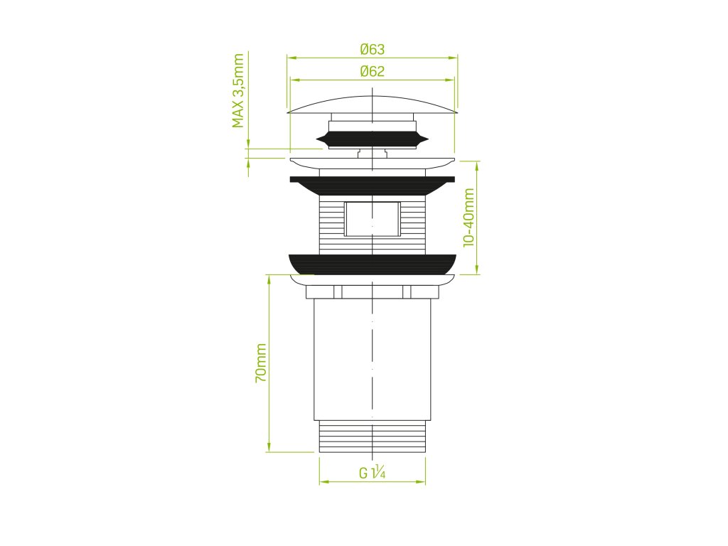 Výpusť je vybavena prodlouženým závitem, který umožňuje nastavení hloubky montáže – jeho utažením lze účinně zakrýt odtokový otvor. Otevírání a zavírání odpadu probíhá pomocí mechanismu klik-klak, tedy jednoduchým stisknutím horní části výpusti, což zajišťuje pohodlné každodenní používání.