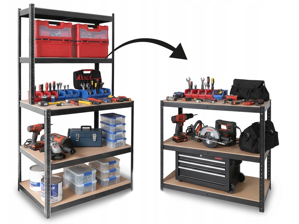 Pevný, funkční a mimořádně stabilní – ideální řešení pro garáže, dílny, sklady, archivy nebo sklepy. Nabízí nejen vysokou nosnost a odolnost, ale také možnost využití jako pracovní stůl.