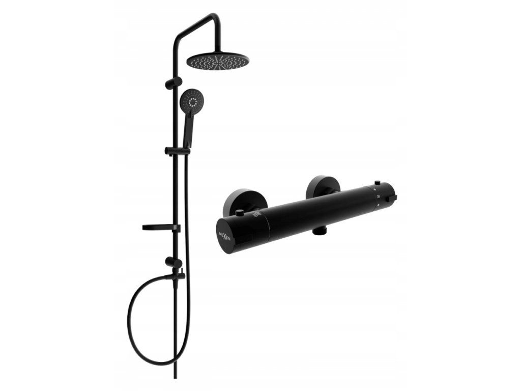 Nástěnná sprchová souprava s dešťovou hlavicí a termostatickou baterií – černá