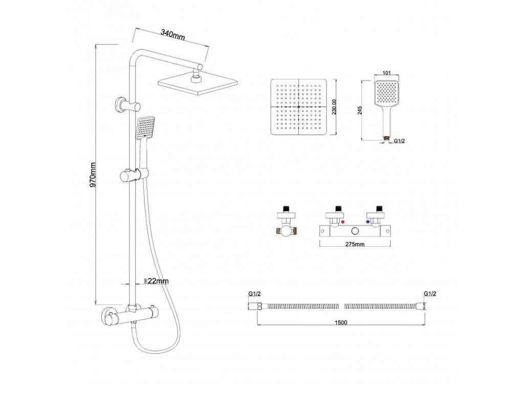 Sada obsahuje vysoce kvalitní termostatickou sprchovou baterii s regulací průtoku a směšovačem teploty vody a přepínačem proudu vody mezi dešťovou hlavicí a ruční sprchou. Je vybavena funkcí přesného nastavení teploty, což v kombinaci s blokádou horké vody na 38 °C zaručuje vysoký komfort a bezpečnost při používání sprchy. Keramická hlavice baterie (35 mm) zaručuje dlouhou životnost a odolnost. Sprchová hlavice a ruční sprcha jsou vybaveny nejnovějším systémem ANTI-CALC, který zabraňuje usazování vodního kamene.