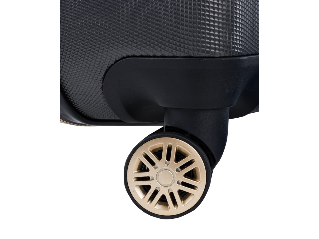 Díky modernímu systému pojezdu (čtyři dvojitá, o 360 stupňů otočná kolečka) je kufr obratný a jezdí perfektně bez ohledu na kvalitu povrchu. Výsuvný dvoustupňový rám, rovněž v poutavé zlaté barvě, s nastavitelnou výškou vám umožní optimálně upravit délku rukojeti podle vašich osobních preferencí.