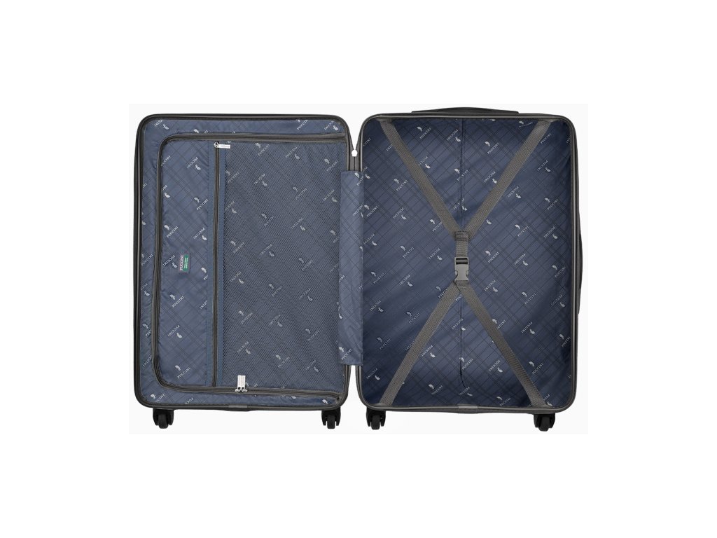 Elegantní žebrovitý vzor na celém povrchu dodávají stylový vzhled. Vnitřek kufru je rozdělen na dvě části. Jeden je uchycen popruhy, které umožňují připevnit zavazadla. Druhá přihrádka se uzavírá klopou s přídavnou síťovanou kapsou.