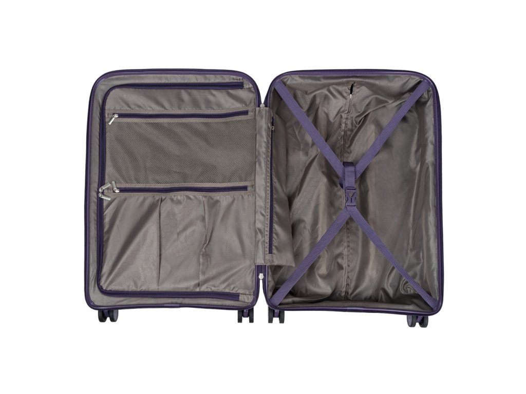 Pečlivě promyšlený vnitřek kufru zajišťuje pohodlné balení a pořádek během cesty. Hlavní přihrádka je rozdělena na dvě části. První část má nastavitelná ramínka, která zabraňují klouzání šatní skříně. Druhá polovina je uzavřena přihrádkou na zip se dvěma kapsami na zip. Přihrádky jsou vyloženy elegantní podšívkou.
