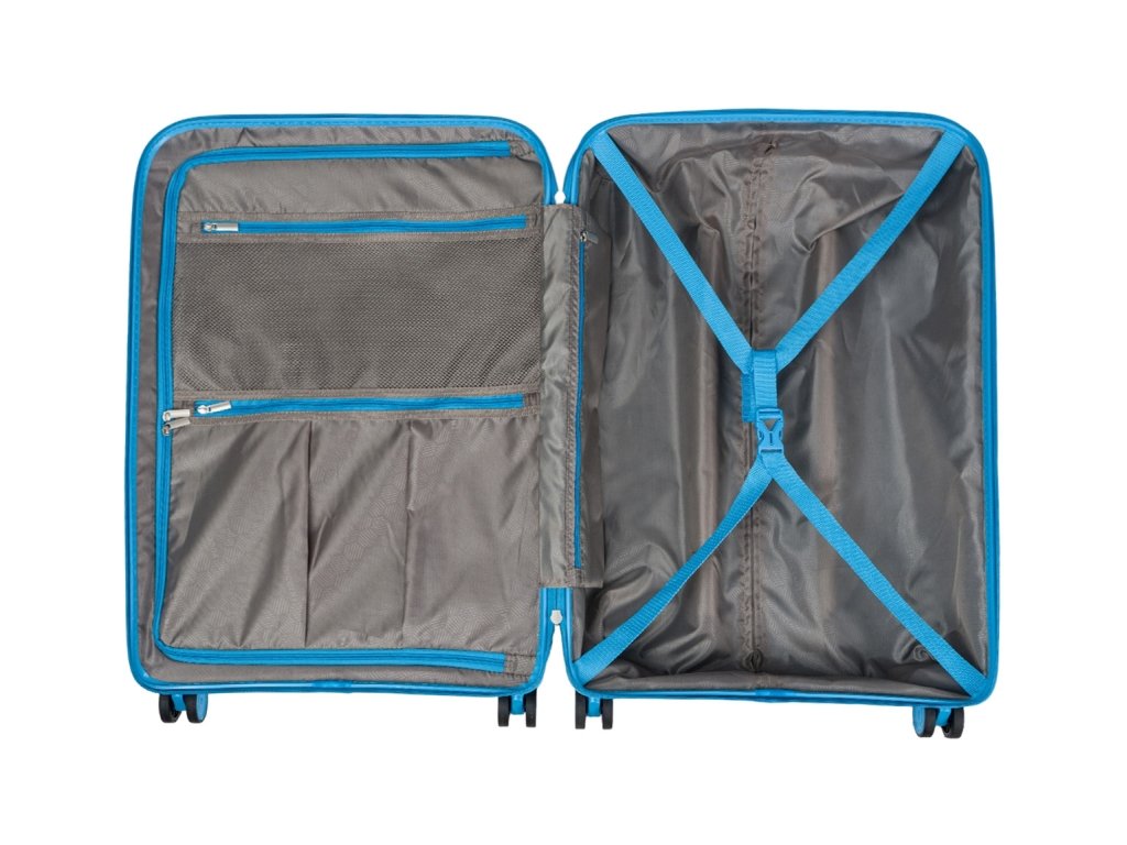 Pečlivě promyšlený vnitřek kufru zajišťuje pohodlné balení a pořádek během cesty. Hlavní přihrádka je rozdělena na dvě části. První část má nastavitelná ramínka, která zabraňují klouzání šatní skříně. Druhá polovina je uzavřena přihrádkou na zip se dvěma kapsami na zip. Přihrádky jsou vyloženy elegantní podšívkou.