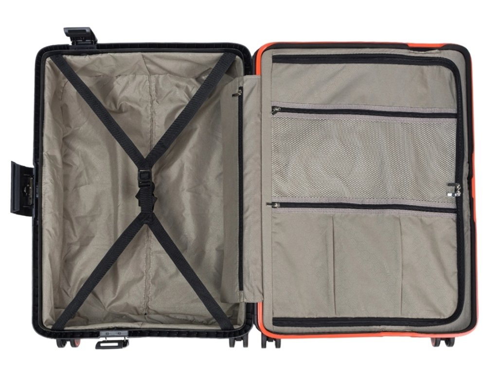 Pečlivě promyšlený vnitřek kufru zajišťuje pohodlné balení a pořádek během cesty. Hlavní přihrádka je rozdělena na dvě části. První část má nastavitelná ramínka, která zabraňují klouzání šatní skříně. Druhá polovina je uzavřena přihrádkou na zip se dvěma kapsami na zip. Kufr má navíc dlouhou funkční kapsu na zip. Komory jsou lemovány elegantní podšívkou se značkou Puccini.
