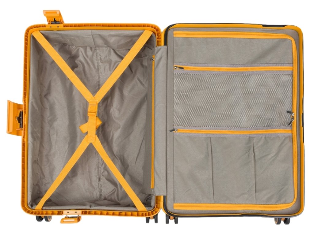 Pečlivě promyšlený vnitřek kufru zajišťuje pohodlné balení a pořádek během cesty. Hlavní přihrádka je rozdělena na dvě části. První část má nastavitelná ramínka, která zabraňují klouzání šatní skříně. Druhá polovina je uzavřena přihrádkou na zip se dvěma kapsami na zip. Kufr má navíc dlouhou funkční kapsu na zip. Komory jsou lemovány elegantní podšívkou se značkou Puccini.