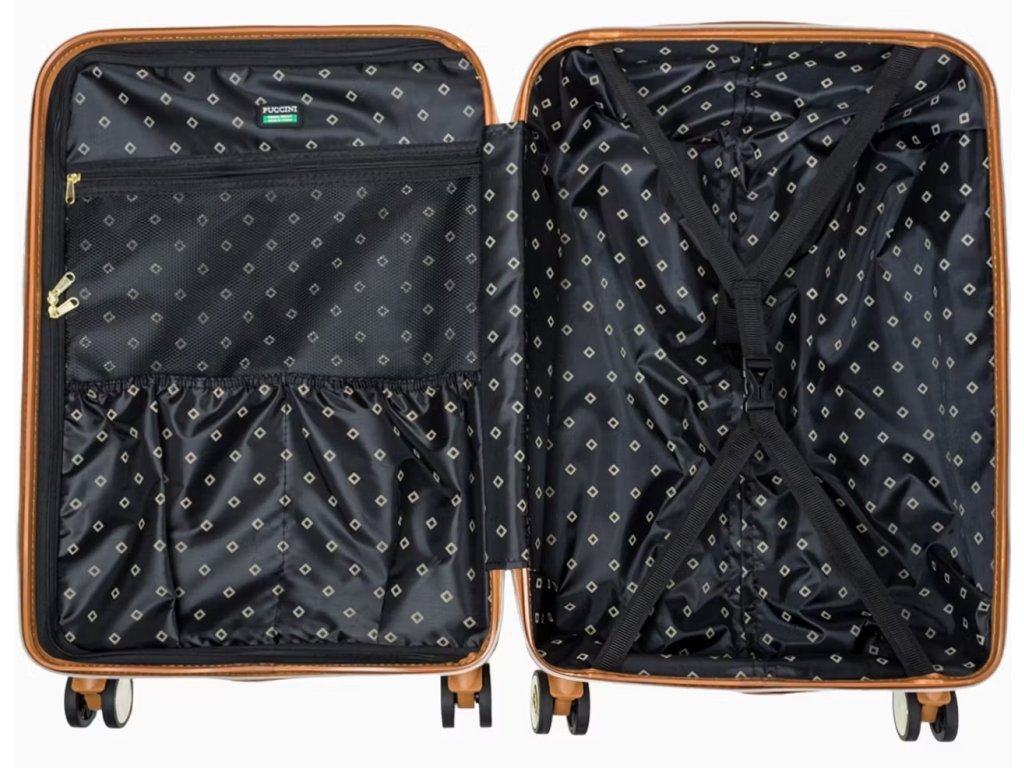 Pečlivě promyšlený vnitřek kufru zajišťuje pohodlné balení a pořádek během cesty. Hlavní přihrádka je rozdělena na dvě části. První část má nastavitelná ramínka, která zabraňují pohybu oděvu uvnitř. Druhá polovina se uzavírá přihrádkou na zip, se síťovanou kapsou na zip a dvěma otevřenými kapsami. Vnějšek je lemován elegantní černou podšívkou s geometrickým vzorem. Všechny kovové prvky jsou zlaté barvy.