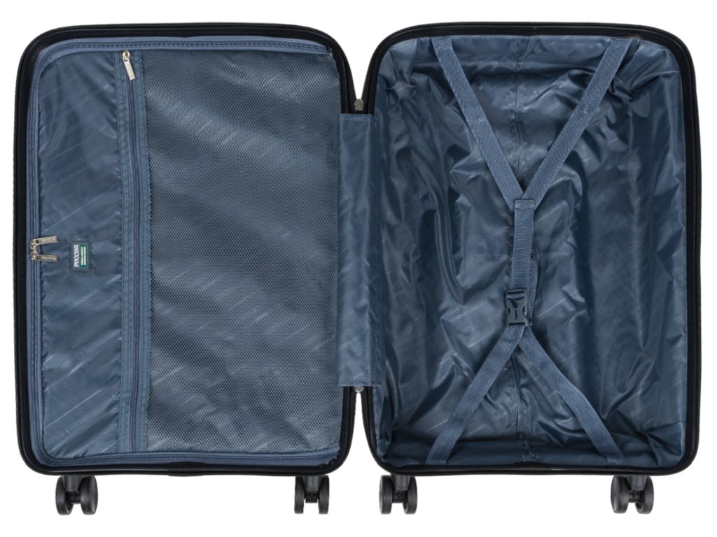 Pečlivě promyšlený vnitřek kufru zajišťuje pohodlné balení a pořádek během cesty. Hlavní přihrádka je rozdělena na dvě části. První část má nastavitelná ramínka, která zabraňují klouzání obsahu uvnitř. Druhá polovina se uzavírá přihrádkou na zip a síťovanou kapsou na zip. Přihrádky jsou vyloženy elegantní podšívkou.