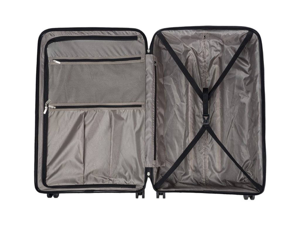 Pečlivě promyšlený vnitřek kufru zajišťuje pohodlné balení a pořádek během cesty. Hlavní přihrádka je rozdělena na dvě části. První část má nastavitelná ramínka, která zabraňují klouzání šatní skříně. Druhá polovina je uzavřena přihrádkou na zip se dvěma kapsami na zip. Přihrádky jsou vyloženy elegantní podšívkou.