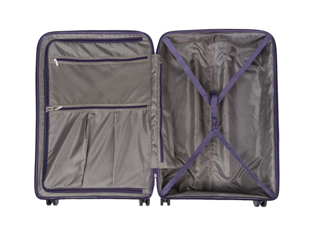 Pečlivě promyšlený vnitřek kufru zajišťuje pohodlné balení a pořádek během cesty. Hlavní přihrádka je rozdělena na dvě části. První část má nastavitelná ramínka, která zabraňují klouzání šatní skříně. Druhá polovina je uzavřena přihrádkou na zip se dvěma kapsami na zip. Přihrádky jsou vyloženy elegantní podšívkou.