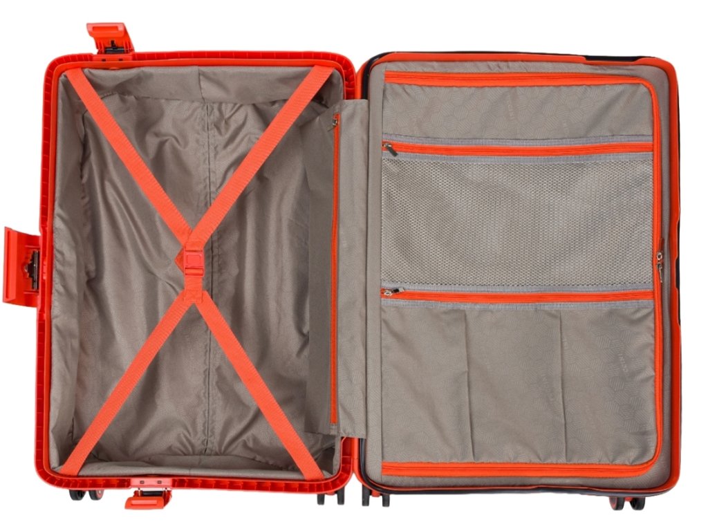 Pečlivě promyšlený vnitřek kufru zajišťuje pohodlné balení a pořádek během cesty. Hlavní přihrádka je rozdělena na dvě části. První část má nastavitelná ramínka, která zabraňují klouzání šatní skříně. Druhá polovina je uzavřena přihrádkou na zip se dvěma kapsami na zip. Kufr má navíc dlouhou funkční kapsu na zip. Komory jsou lemovány elegantní podšívkou se značkou Puccini.