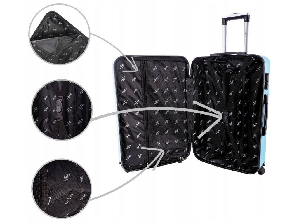 Uvnitř cestovního kufru jsou elastické popruhy, které jsou určeny k ochraně částí oblečení proti pohybu. K dispozici je také druhá, menší přihrádka na zip. Podšívka s logem dodává vnitřku zavazadla stylový vzhled. Usnadněním při přepravě se zavazadly jsou čtyři otočná gumová kolečka, která se perfektně hodí i na nerovný povrch. Stabilizaci zajistí vnitřní, nastavitelný duralový rám.